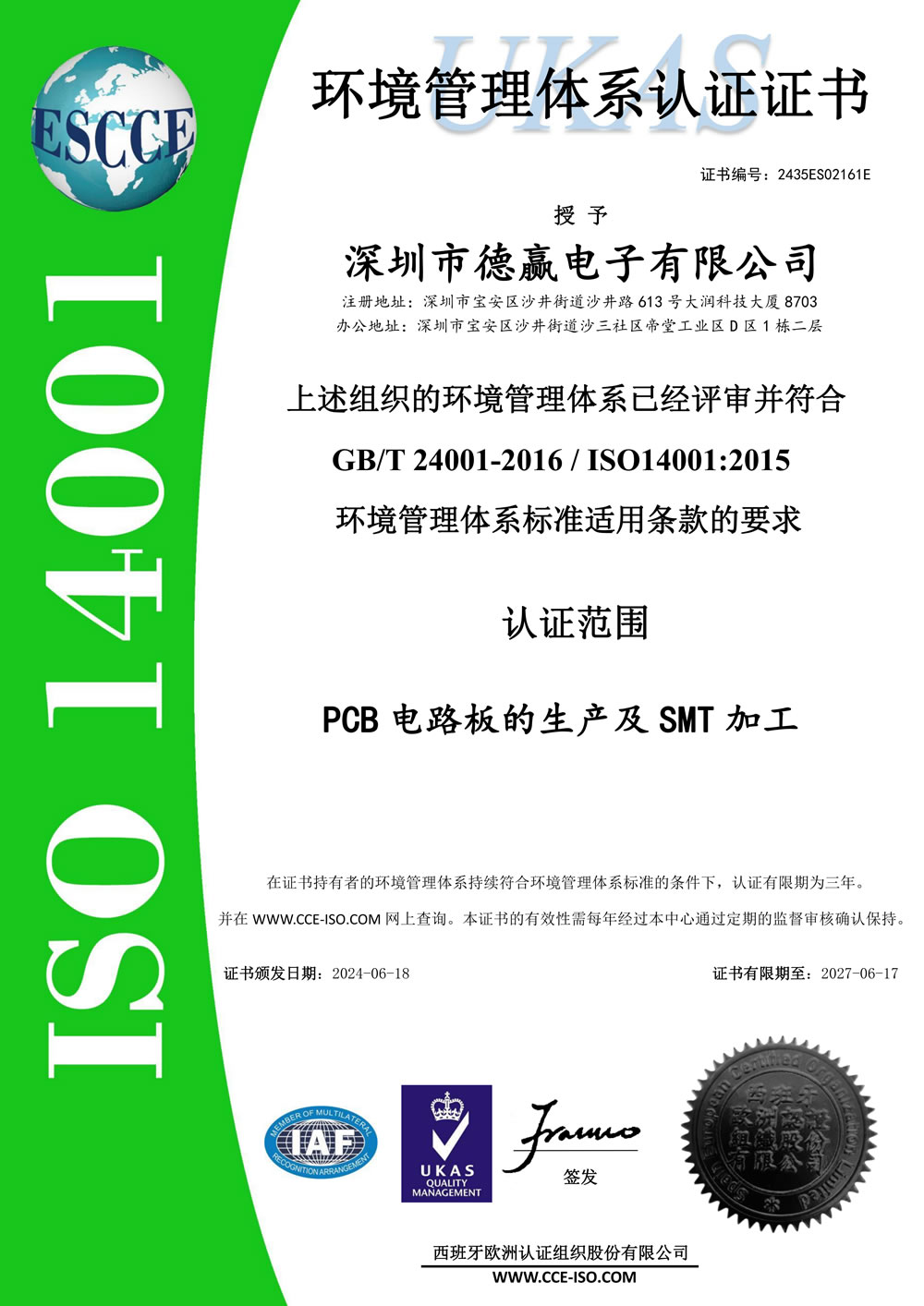 环境管理体系认证证书